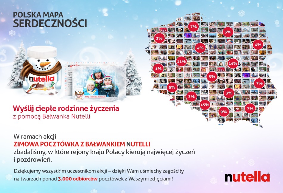 Każdy mógł stworzyć spersonalizowaną pocztówkę z własnym zdjęciem i życzeniami, a następnie wydrukować ją na stronie, tak by w ciągu kilku dni listonosz dostarczył ją pod wskazany adres. Każdy mógł w prosty, ale i wyjątkowy sposób przekazać pozytywne emocje najbliższym. Wystarczyło przez www lub serwis w wersji mobilnej wrzucić swoje zdjęcie, wybrać jedną z dostępnych ramek, dopisać życzenia i gotowe! Wszystko dzięki wykorzystaniu platformy Envelo.pl oraz dzięki Nutelli, która postanowiła ocieplić tegoroczną zimę życzeniami.