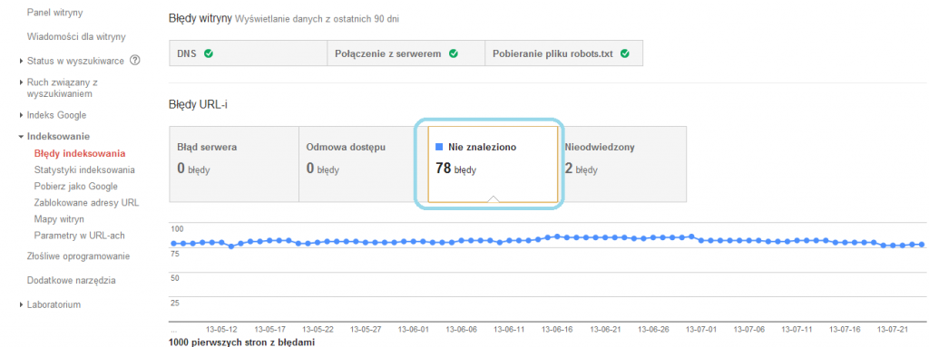 Czasem, pomimo skrupulatnego przygotowania listy przekierowań 301, zdarzają się przeoczenia i w nowej wersji serwisu powstają strony błędu 404. W przypadku dużych serwisów, które posiadają wiele linków zwrotnych, może zajść sytuacja, w której odnośniki kierują właśnie do takich stron. Bez podjęcia działań z naszej strony tracimy w takim przypadku część linków, a tym samym możemy notować niższe pozycje w wyszukiwarce dla niektórych słów kluczowych. Wtedy istotne staje się śledzenie błędów, jakie napotykają roboty Google odwiedzając nasz serwis. W tym celu należy skorzystać z Narzędzi Google dla Webmasterów ( Indeksacja -> Błędy indeksowania -> Nie znaleziono), o których pisałem jakiś czas temu na blogu.