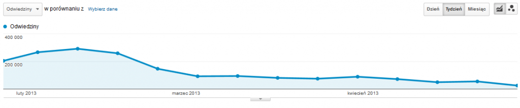 Poniższa grafika przedstawia wykres z Google Analytics, na którym pokazany został spadek ruchu w jednym z serwisów, gdzie zmiana CMS’a nie wiązała się z pracami SEO.