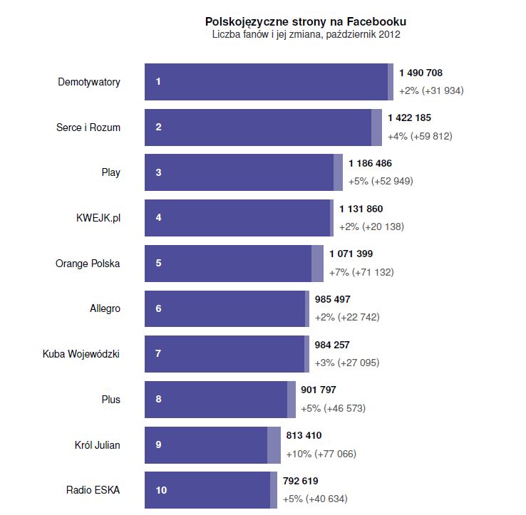 Pierwsza piątka największych fanpage’ów jest stabilna i czeka, aż dołączy do niej szósty milionowy fanpage. Pewnie w przyszłym miesiącu okaże się, czy będzie to Allegro czy też Kuba Wojewódzki, który znów mocno rywalizuje z Allegro o szóste miejsce w rankingu. Wśród największych, Demotywatory utrzymują pierwsze miejsce i zaraz będą mogły się pochwalić liczbą 1,5 miliona fanów. Jednak jeżeli tempo rozwoju Serca i Rozumu pozostanie tak szybkie jak w ostatnich dwóch miesiącach, Nowy Rok może przynieść zmianę lidera polskiego Facebooka. Play po wyprzedzeniu Kwejka dzielnie idzie do przodu umacniając swoją pozycję trzeciego największego profilu. Kwejk, chociaż dał się wyprzedzić pod względem liczby fanów, znów zaangażował największą liczbę użytkowników. Jednak w rankingach według Interactivity Index i Talking About pierwsze są Demotywatory. Ostatni z milionowych fanpage’y, Orange Polska, cieszy się wciąż bardzo dużym przyrostem liczby fanów – 71 tysięcy nowych fanów w październiku to więcej niż zdobyła strona Serce i Rozum (60 tys.) i ponad dwukrotnie więcej niż zdobywa lider rankingu (32 tysiące nowych użytkowników w październiku).