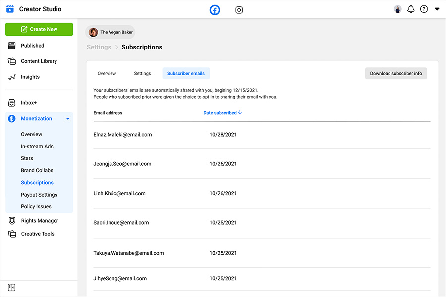Oprócz pomagania twórcom w zdobywaniu większych zarobków, Facebook zapewnia im też większą kontrolę nad własną działalnością. Od grudnia zostanie udostępniona możliwość pobierania adresów e-mail subskrybentów, aby twórcy mogli utrzymywać relacje z nimi także poza Facebookiem. Dotyczy to nowych użytkowników, natomiast osoby, które już subskrybują twórcę, mogą wyrazić zgodę na udostępnianie swojego adresu e-mail w sekcji ustawień centrum wsparcia na stronie wybranego twórcy.