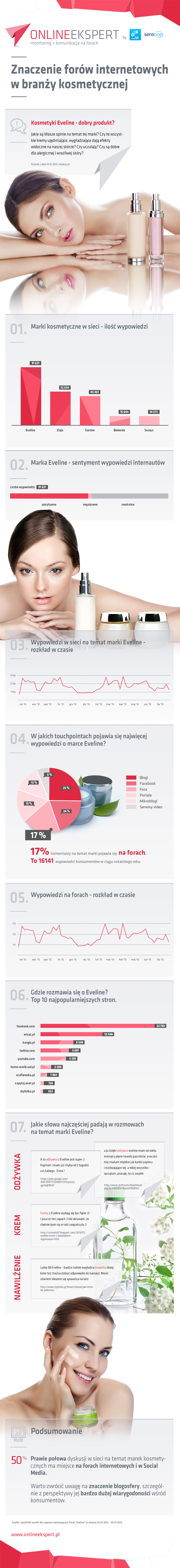 Główna część badania została przeprowadzone na przykładzie marki Eveline ze względu na dużą liczbę wypowiedzi na jej temat (ponad 91 tys. w ciągu ostatnich 12 miesięcy). W badaniu uwzględniono m.in. takie dane jak: liczba wypowiedzi w sieci na temat najpopularniejszych marek kosmetycznych, najistotniejsze domeny i touchpointy z perspektywy marek kosmetycznych, rozkład wypowiedzi na temat marki Eveline w czasie oraz ich sentyment, a także insighty konsumenckie. Jak wynika z raportu, Eveline jest jedną z najchętniej dyskutowanych marek kosmetycznych w Polsce. Konsumentki wypowiadają się o marce zwykle pozytywnie, bądź neutralnie. Uwagę zwraca sezonowość wypowiedzi – liczba dyskusji na temat kosmetyków widocznie spada w okresie zimowym.