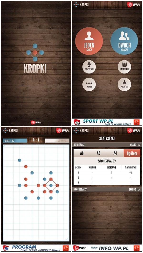 Kropki to gra logiczna. Aplikacja umożliwia prowadzenie rozgrywek w trybie jednoosobowym z tzw. „sztuczną inteligencją” na trzech poziomach trudności. Pozwala również grać we dwie osoby na jednym urządzeniu. Gracze mają do dyspozycji trzy plansze, które dostosowują się do rozmiarów ekranów wszystkich urządzeń mobilnych. Gracz ma wgląd do statystyk. Może też polecić aplikację za pomocą Facebooka, e-maila oraz SMSa.
