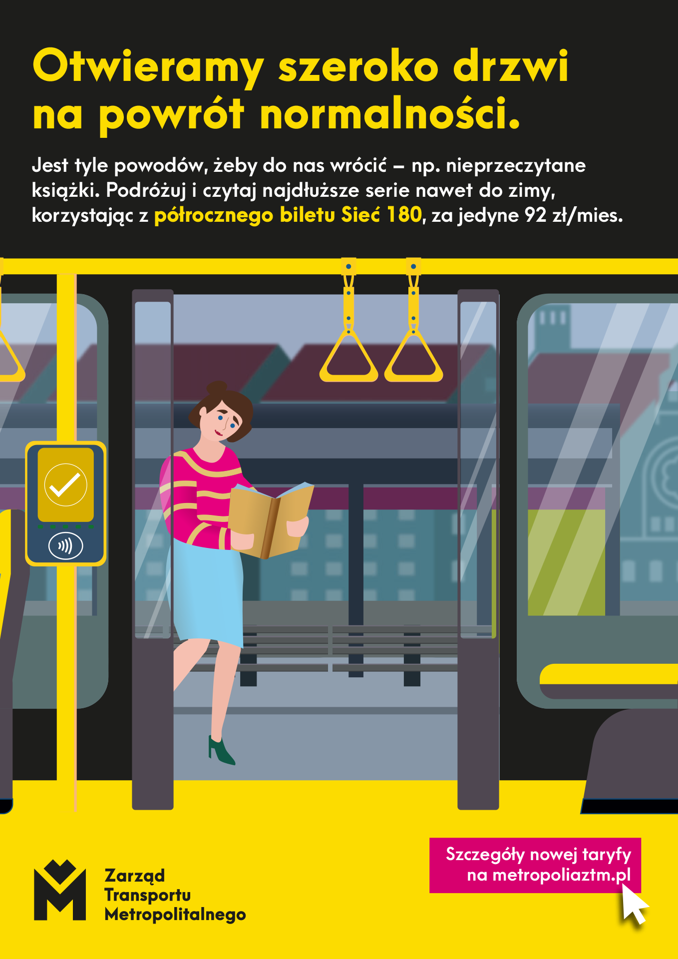Tym razem, w ramach najnowszej kampanii „#Otwieramy szeroko drzwi na powrót normalności“, ZTM zachęca do powrotu do komunikacji miejskiej, promuje także nowe rozwiązania zawarte w ofercie. W kwietniu br. wprowadzona została zmodyfikowana taryfa, obejmująca m.in. nowe rodzaje biletów, w tym specjalny – półroczny, którego cena w przeliczeniu na miesiąc to nieco ponad 90 zł (bilet 30-dniowy, kupowany co miesiąc to 159 zł).