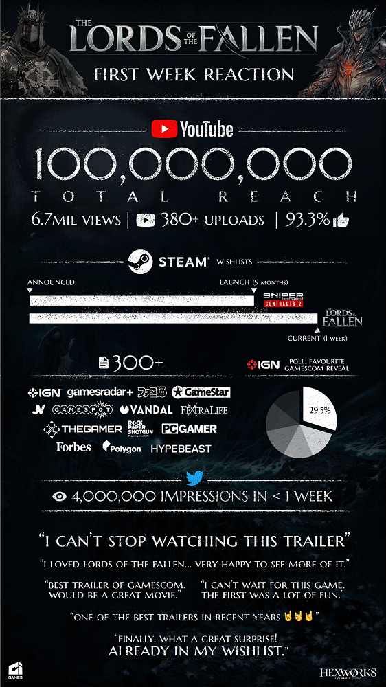 Bardzo się cieszę z najmocniejszego w historii CI Games startu kampanii reklamowej w tym świetnego przyjęcia trailera Lordsów.– mówi Marek Tymiński, prezes zarządu CI Games – Sama gra bardzo spodobała się naszym obecnym i potencjalnym partnerom, którzy zobaczyli ją na zamkniętych pokazach.