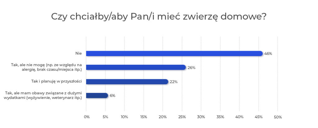 51% ankietowanych deklaruje posiadanie zwierząt domowych, a wśród tych, którzy ich jeszcze nie mają – 22% planuje to w przyszłości. Jednocześnie aż 46% badanych nie chce mieć zwierząt w ogóle.