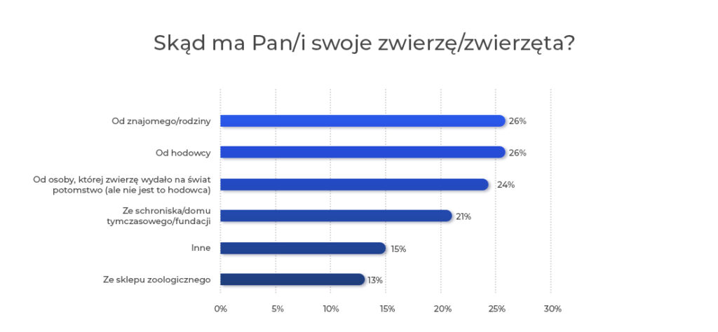 Jeśli chodzi o źródło pochodzenia pupila, odpowiedzi były mocno zróżnicowane – podobny odsetek pytanych wskazał hodowców, rodzinę i znajomych, jak i schroniska czy fundacje.