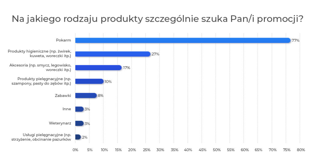 Aż 70% Polaków aktywnie szuka promocji przy zakupach dla pupili. Najczęściej dotyczą one karmy (77%), produktów higienicznych (27%) i akcesoriów (17%).