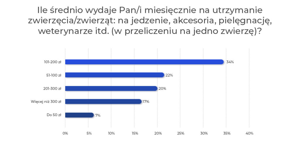 Ile wydajemy na nasze zwierzęta? Największa grupa właścicieli (34%) wydaje na zwierzę od 101 do 200 zł miesięcznie. 22% mieści się w przedziale 51–100 zł, a 20% – 201–300 zł. Aż 73% przyznaje, że wydaje więcej niż rok temu.