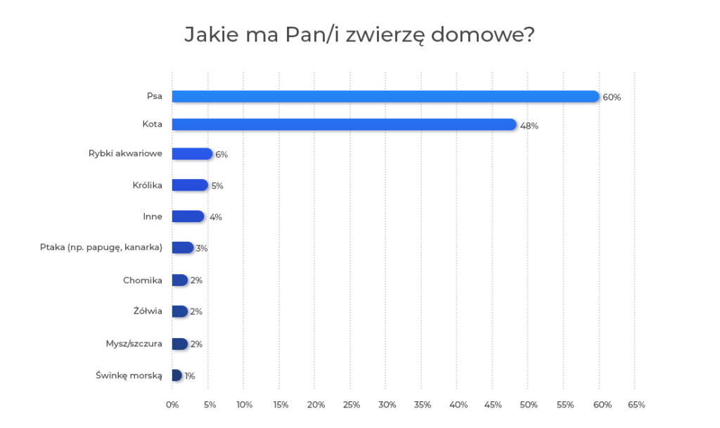 Badanie potwierdziło stereotyp, że Polacy to „psiarze” – 60% badanych opiekuje się psem, a 48% kotem. Podium zamykają rybki akwariowe (6%).