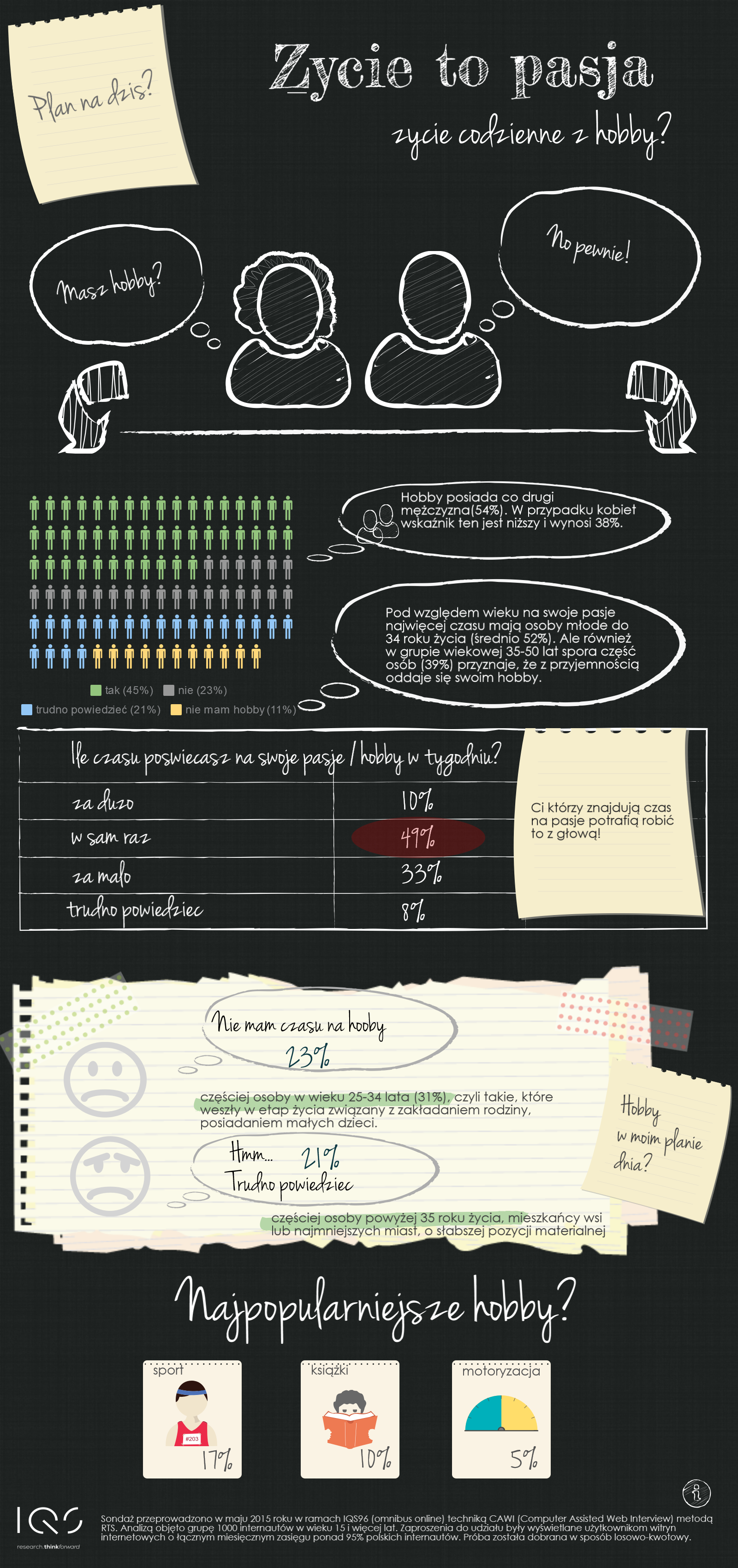 Osoby, które znajdują czas na własne hobby twierdzą w większości (49%), że ilość czasu poświęcana pasjom średnio w tygodniu jest w ich poczuciu wystarczająca – w sam raz, aby pogodzić życie codzienne z hobby. Marta Rybicka podkreśla, że Polacy są coraz lepsi w zachowywaniu równowagi między życiem prywatnym i zawodowym, ale spora grupa (33%) uważa jednak, że czasu tego jest za mało, chcieliby móc poświęcać go na swoje hobby zdecydowanie więcej (osoby powyżej 35 roku życia, z wyższym wykształceniem). Zaledwie co dziesiąty badany (10%) z tej grupy uważa, że hobby pochłania go zbyt mocno (dużo czasu) i są to najczęściej młodzi mężczyźni, uczący się/studiujący, a więc rzeczywiście dysponujący sporym budżetem czasu.