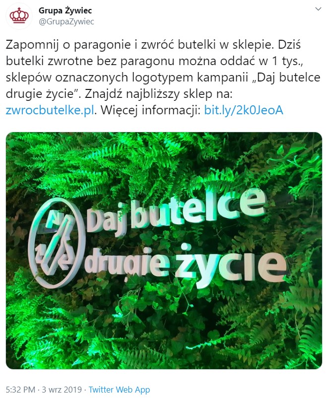 Marka Żywiec ruszyła z nową akcją pod hasłem „Daj butelce drugie życie”, w ramach której zachęca konsumentów do oddawania do sklepów butelek zwrotnych po piwie, nawet bez paragonu.